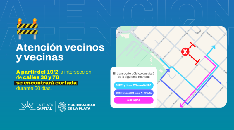 La Municipalidad de La Plata informó que a partir del miércoles 19 de febrero se intervendrá la intersección de las calles 30 y 76 en el marco de la obra “Sistema de Desagües Pluviales del Arroyo El Regimiento – Barrio Cementerio”, que beneficiará a más de 60 mil vecinos.