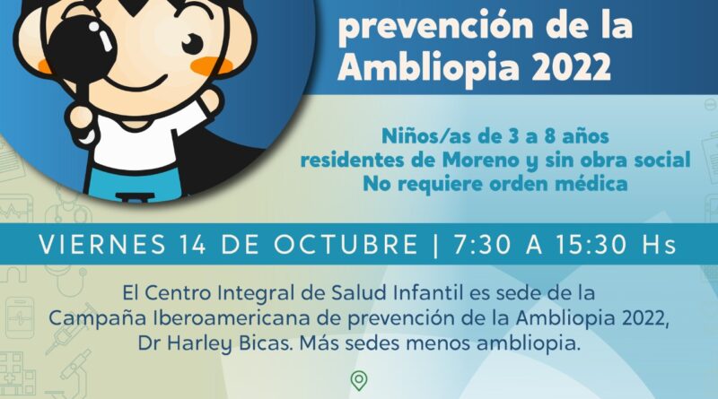 En el marco de la Campaña Iberoamericana de prevención de la Ambliopía, el Municipio de Moreno, a través de la Secretaría de Salud y Ambiente, realiza una jornada de atención médica de salud visual el día viernes 14 de octubre, de 7.30 a 15.30 horas.