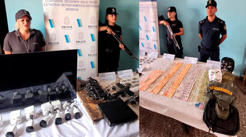 Durante la intervención se secuestraron 23 envoltorios con 48,8 gramos de cocaína, 10 envoltorios con 51,6 gramos de marihuana, una pistola Bersa Thunder calibre 9 mm con numeración suprimida y 15 proyectiles, otra pistola Bersa Thunder calibre 40, máscaras y chalecos oficiales de Gendarmería Nacional, cinco teléfonos celulares y $220.000 en efectivo. Además, fueron incautados dos vehículos y una motocicleta.