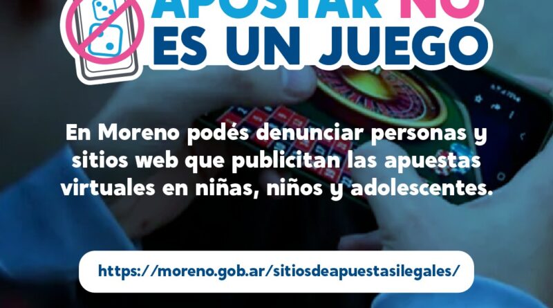 Para prevenir y concientizar sobre el riesgo de estas prácticas, el gobierno local lanzó el portal https://moreno.gob.ar/sitiosdeapuestasilegales/ donde se pueden cargar sitios web que promocionen, ofrezcan u organicen juegos de azar online sin la autorización de la autoridad provincial competente y serán bloqueados en el servicio WIFI que ofrece el Estado municipal, así como en espacios e instituciones públicas para impedir el acceso de niñas, niños y jóvenes a estas páginas ilegales; también se puede denunciar a personas que promuevan, publiciten u ofrezcan apuestas en adolescentes a través de la Dirección de Defensa de Usuarios y Consumidores municipal.