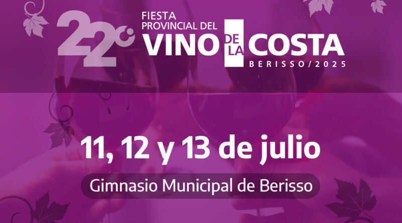 La Municipalidad de Berisso, informa a la comunidad que hoy viernes 11, sábado 12 y domingo 13 de julio se realizará la 22° edición de la Fiesta Provincial del Vino de la Costa en el Gimnasio Municipal (calles 9 y 169).