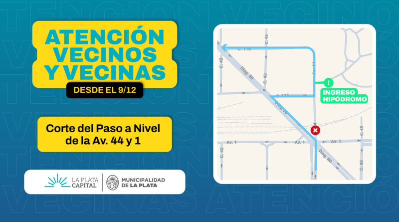 La Municipalidad de La Plata anticipó que desde el martes 9 de diciembre permanecerá cerrado al tránsito el paso a nivel de 44 y 1 con motivo de la ejecución de reparaciones en las vías.